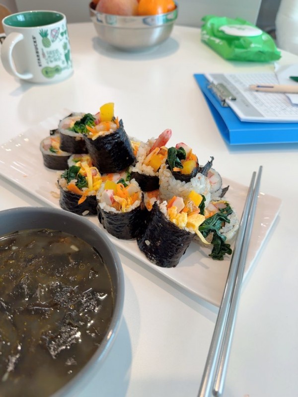 손 많이 가는 김밥을 선생님이 뚝딱 만들어주셨어요.
